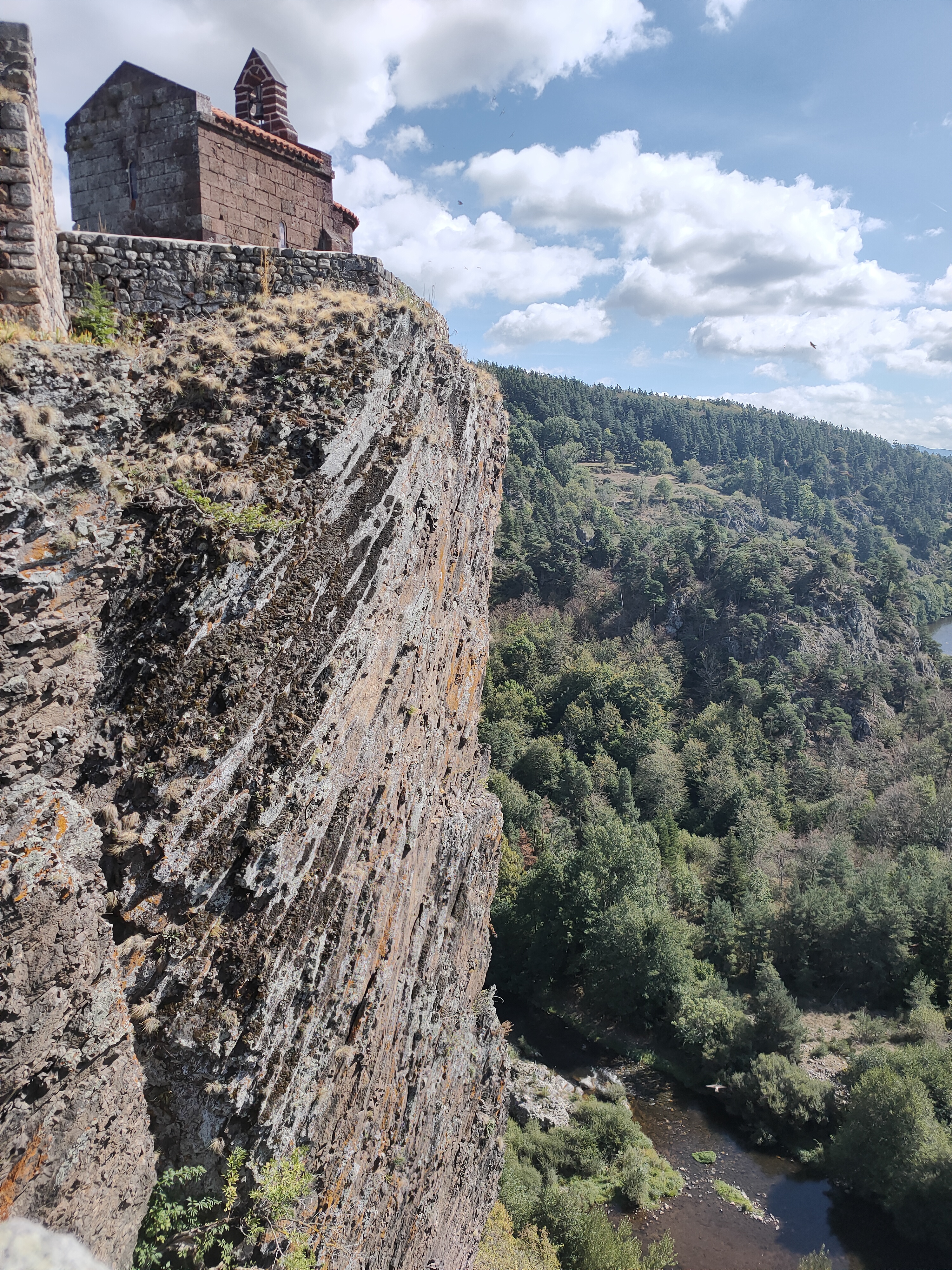 Le plus spectaculaire réside dans le fait que cet ensemble est 'posé' sur un piton rocher. Côté village, la hauteur du vide est 'habituelle', mais côté vallée de la Loire, c'est une falaise comme à Etretat.😱 Il ne fallait pas avoir le vertige.... Au fond à gauche, j'ai adoré les 2 latrines. Rien de plus simple, une pierre taillée comme une lunette de WC moderne, et au lieu d'une cuvette en dessous, un trou par lequel se précipitent dans le vide les offrandes des intestins. Y'a pas plus économique, et c'est jamais en panne 🌀