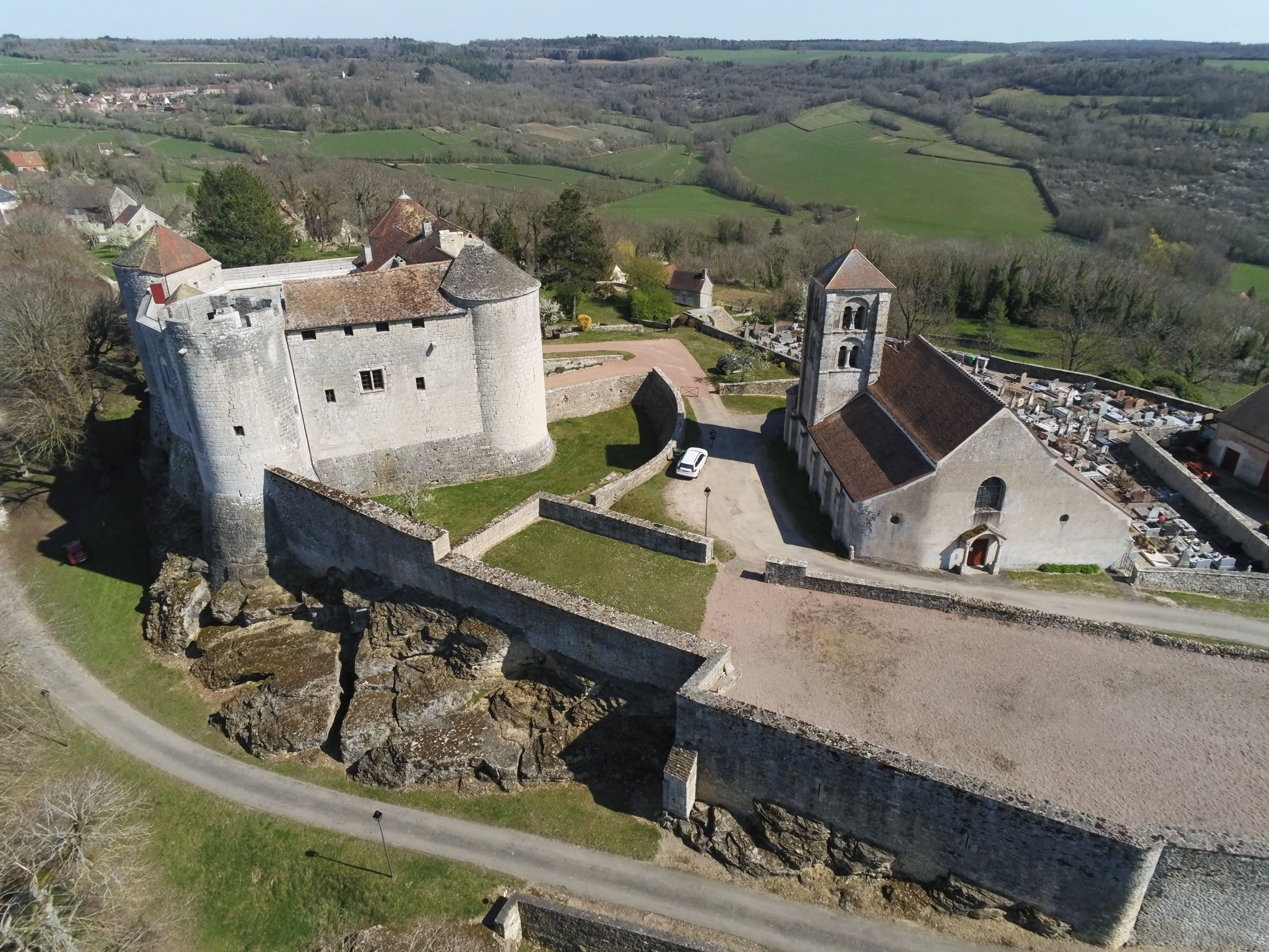 Imposant château médiéval qui n est pas ouvert au public encerclé d'une promenade de tilleuls centenaires où il fait bon l été de pique niquer face à la vue imprenable sur la campagne Bourguignonne