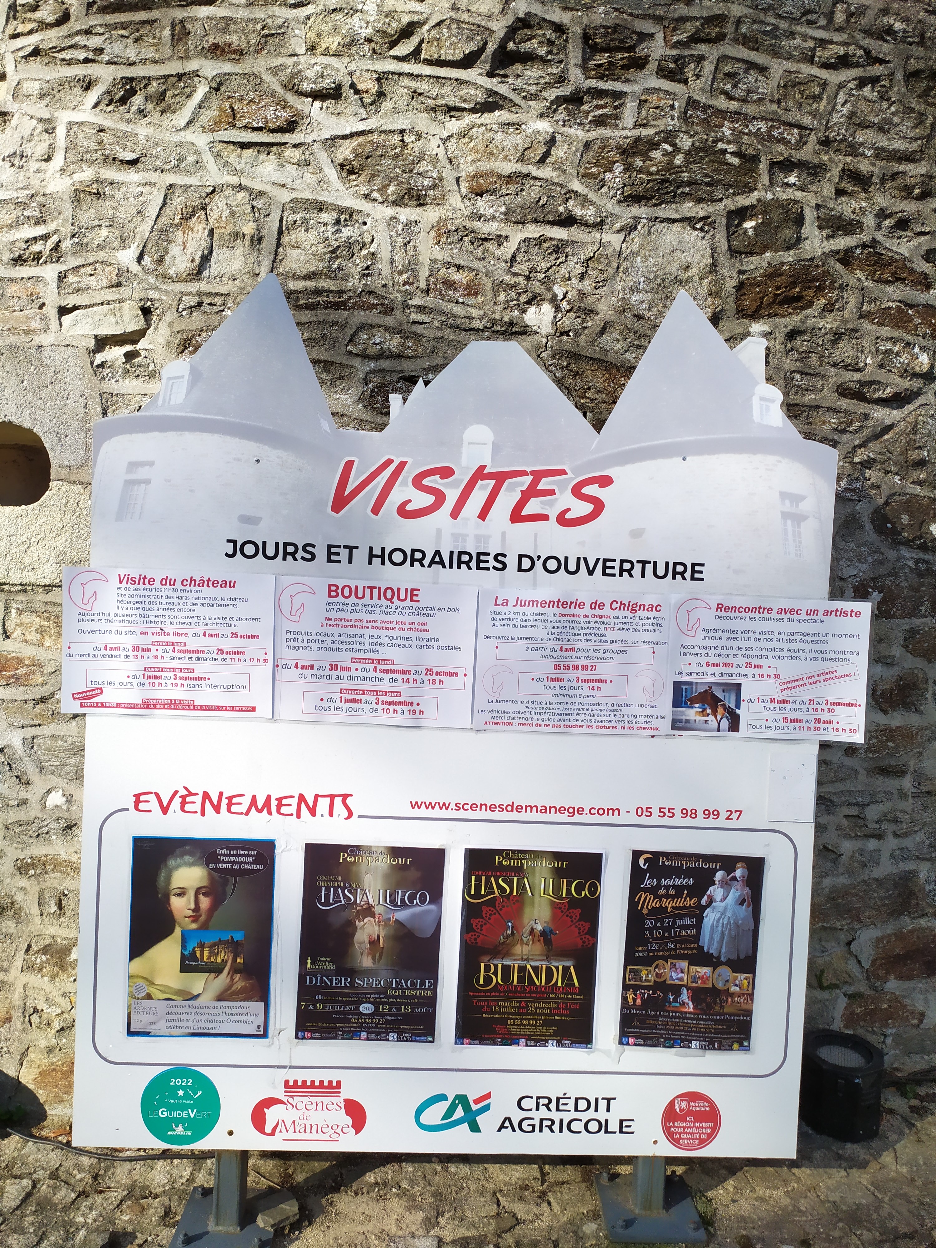 Visite du château et du haras national : très beau château, de belles salles, de beaux costumes et l'histoire de la Marquise à découvrir...et ensuite passage par les écuries, l'hippodrome et la jumenterie. Nous avons passé un bon moment grâce à notre guide sympathique, dynamique et passionnée d'histoire. Nous sommes revenus en août pour le spectacle équestre : un grand BRAVO à la compagnie Hasta Luego pour ses numéros d'acrobaties à couper le souffle. Belle osmose entre le cheval et l'homme. Et pour terminer notre périple sur Pompadour, nous avons assisté aux soirées de la Marquise. C'est vraiment un spectacle de qualité. Le château de Pompadour rend un bel hommage à sa Marquise ; des costumes magnifiques, des bénévoles investis et passionnés, un beau voyage dans le temps. A voir absolument....Merci et bravo à tous ceux qui ont contribué à rendre ces 3 jours inoubliables.Pompadour, petit par sa taille, mais grand par son talent.