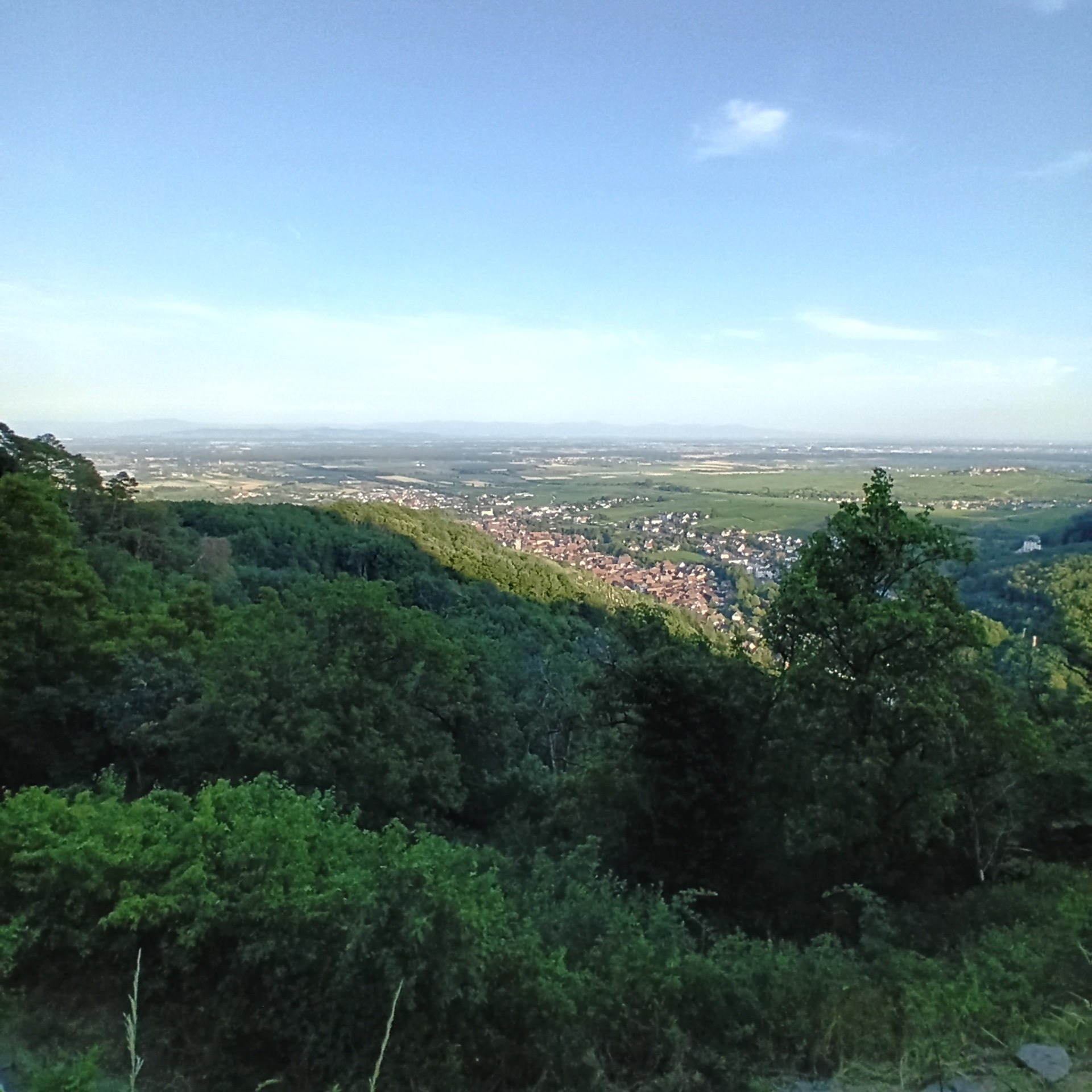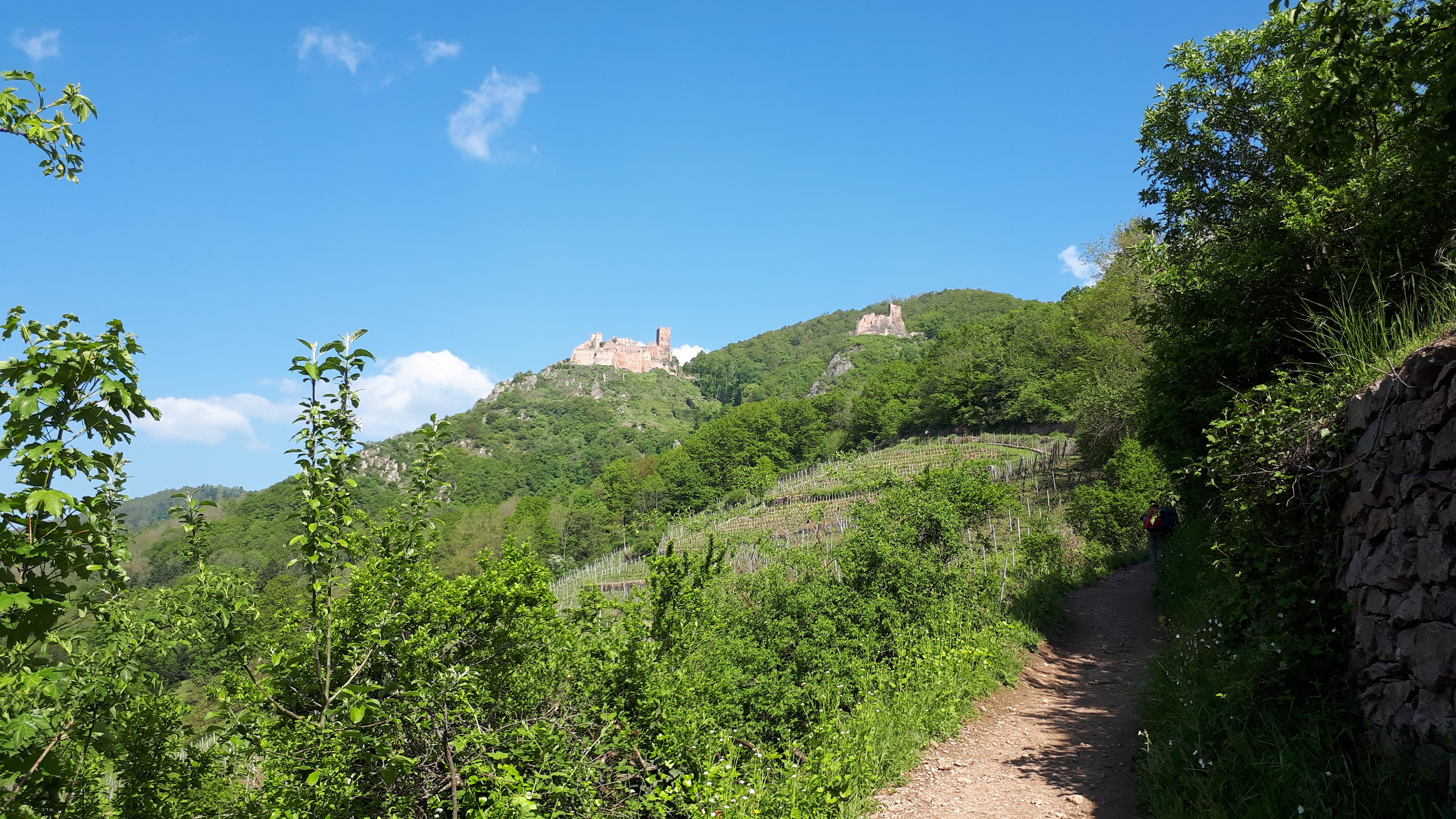 belle petite montée sportive depuis le.centre ville, je conseille d attaquer par le flanc droit de la ville, le long des vignes, lensentier est simple à suivre et ombragé surtout pour l été. A l'arrivée environ 30/40mn plus haut, les deux. châteaux , accessibles (ruines aménagées) et magnifique panorama, les alpes au loin par ciel bleu, la forêt noire, Ribeauvillé en contrebas, la plaine d alsace....top Ne pas négliger derrière la vue sur les forêts vosgienne, surtout l automne. Redescendez vers Ribeauvillé depuis le sentier rocheux , à découvert, ludique, et vue tout le long magnifique jusqu'en bas. Basket minimum, y a des cailloux...à l arrivée on est au bout de la.Haute ville, y. a plus qu'à remonter les magnifiques rues pittoresque, s arrêter aux terrasses ou salon de thé, ouverts mm les dimanches 😁😁