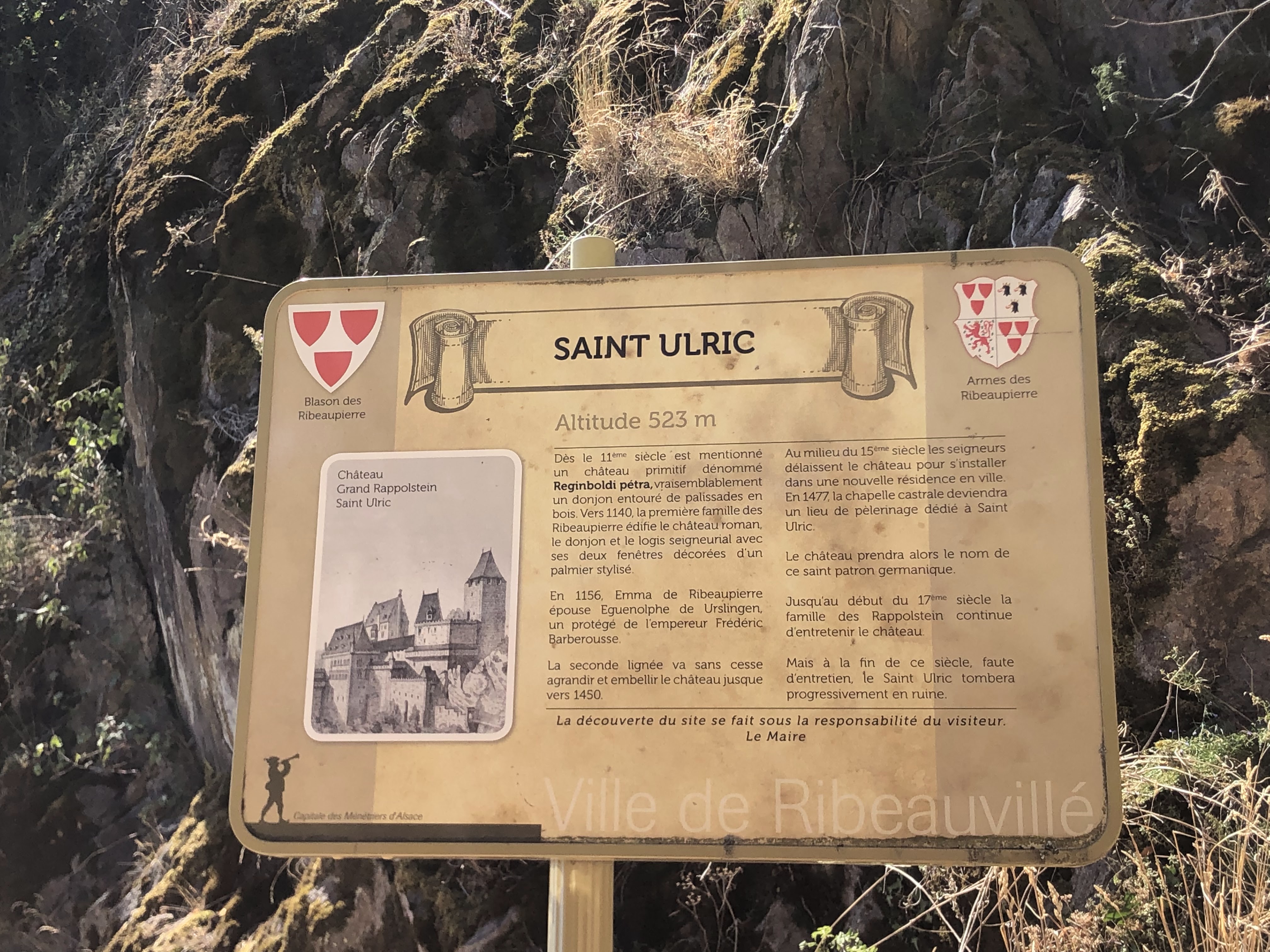 Ok c’est des ruines mais de belles ruines et comme disait je ne sais plus qui, c’est pas la destination qui compte mais le voyage. Et bah c’est les deux pour le château saint Ulrich. Une belle balade de 40-45 min bien pentue et une superbe vue sur le haut Rhin. Le château est en ruines mais il y a pas mal de choses à voir, La Chapelle par ex. Par contre nombreuses marches. A faire si vous êtes à ribeauville